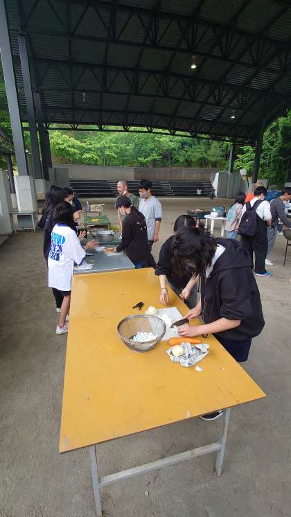 野外炊事が始まりました。メニューは、定番のカレーライスです。実行委員会作成の校外学習のしおりには「おいしいカレーの作り方」も載っています。みんなで協力して楽しく調理ができているようです。
