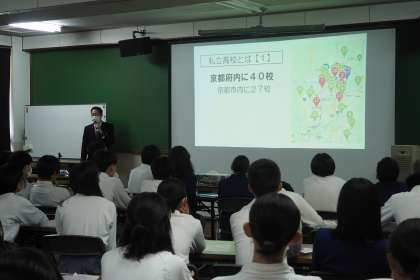 6月26日(月)6時間目、3年生が会議室に集合し「高校進路講話」を実施ました。今日は洛西高校と京都成章高校の先生方にお越しいただき、お話していただきました。それぞれの高校のことだけではなく、公立高校と私立高校、それぞれの特色や違いなど、写真をまじえてわかりやすく説明していただきました。生徒たちは高校の先生方のお話を、しっかりと聞いていました。さすがは3年生です。