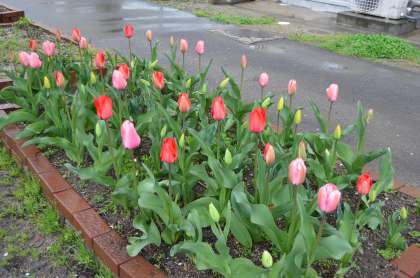 昨日と今日のチューリップの花のようすのちがいと、今朝の校内の花風景をご覧ください。
