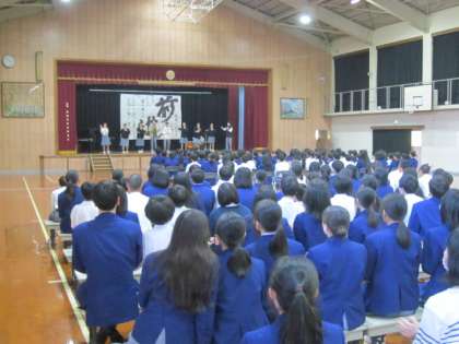 4月25日(木)6限に、新入生歓迎会を体育館にて実施しました。吹奏楽部の演奏と2・3年生たちの温かい気持ちで1年生を迎え、楽しい雰囲気の中で行われました。生徒会本部による「洛中王」クイズ大会で大いに盛り上がり、2・3年生による群読と合唱で歓迎のメッセージと学校生活について伝えました。生徒会本部による「恋ダンス」の発表も行われ、洛西中生徒の心がが一つになった新入生歓迎会でした。