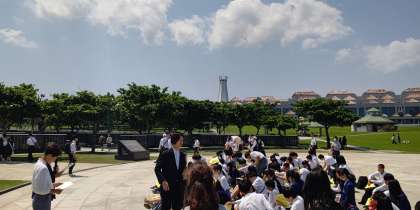 日本で唯一の地上戦が行われたのが沖縄です。たくさんの戦没者を出し、尊い命がたくさん奪われてしましました。セレモニーの様子の奥には、戦没者の名前が刻まれた礎(いしじ)が写っています。