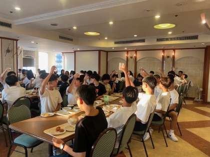 お料理にみんな大満足のようで、生徒の声で「全員で乾杯しよう!」というような声が上がり、みんなで乾杯をしたようです。学年としてのまとまりも、少し垣間見えてるようで、普段と違う環境・状況でだからこそ、成長を感じられる一幕に思います。