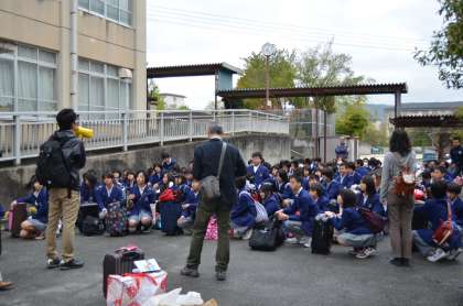参加を予定していた生徒は全員元気な顔をそろえ、7時45分前には大きな荷物を持って、洛西高校前で待機しているバスに向かい学校を後にしました。
