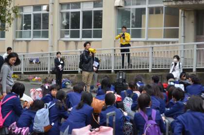 手を振りながら出発を見送る他学年の先生、保護者の方からは、このような温かい言葉かけもあり、2泊3日の楽しい旅の舞台は、洛西の地から沖縄へと移ろうとしています。