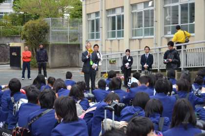 曇り空の中、7時15分過ぎに生徒集合が完了し、いよいよ修学旅行2泊3日の幕が開きました。正門を入ったロータリー横で、まずは“結団式”が行われ、生徒代表Mくんのあいさつを始め、先生方からの簡単な出発に向けての心構え、諸注意や、3年生に同行していただく添乗員とカメラマンのみなさんの紹介などがありました。