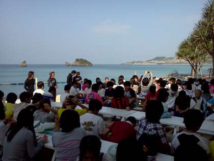 1・3・5・6組の生徒は、午前中はホテル前の砂浜(ビーチ)に集合し、先に述べたとおり、“バナナボート”に乗っての海上散策や砂浜での体験活動を行い、午後からは“むら咲きむら”での体験活動に参加するため、バスで移動をします。