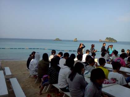 これは、ホテル前のビーチに集まり、インストラクターからの諸注意を受ける直前の写真です。