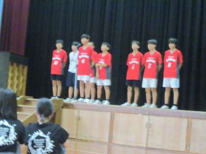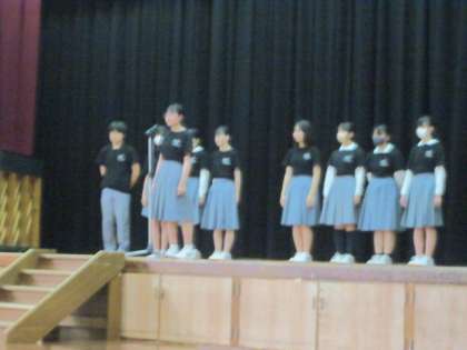 次に夏季大会に向けた練習の様子をまとめた応援動画を全員で見て、大変盛り上がりました。選手宣誓ではソフトテニス部キャプテンが、大きな声で意気揚々とした気持ちを伝えることができました。最後に校長先生から「チーム一丸となって、自分を信じて精一杯頑張ってください。」と激励の言葉をいただきました。