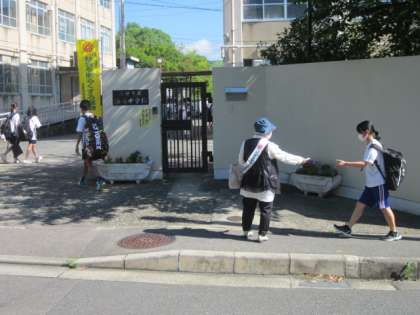 朝の登校時間に合わせて保護司会の方をはじめ地域の方々が、登校してくる生徒一人一人に「おはよう」と声を掛けられて、啓発ティッシュを配られました。ティッシュを受け取った生徒のみなさんは、「おはようございます。」「ありがとうございました。」と元気よく応える生徒や、小声でささやく生徒もおりました。