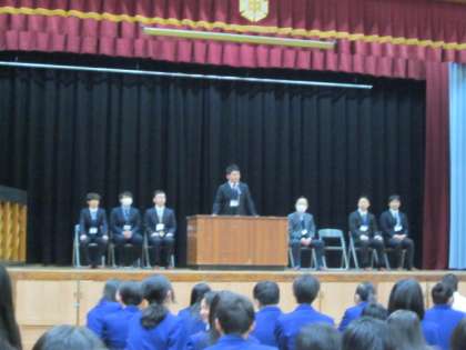 4月8日(火)新しいクラス・名簿番号を確認した後、体育館に移動し、令和7年度 着任式を行いました。今年度、本校にお迎えするのは、11名の先生方です。校歌斉唱を行った後、校長先生から新着任の先生方の紹介があり、代表して住田 瑛先生から着任のご挨拶をいただきました。続いて生徒を代表し、生徒会本部役員の生徒が歓迎の言葉を述べてくれました。新着任されました先生方、今年度どうぞよろしくお願いします。