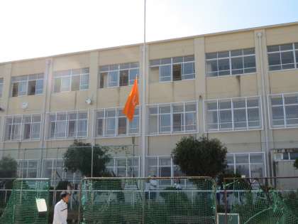 これは、生徒会旗掲揚のシーンです。生徒会本部が数人で旗を揚げています。