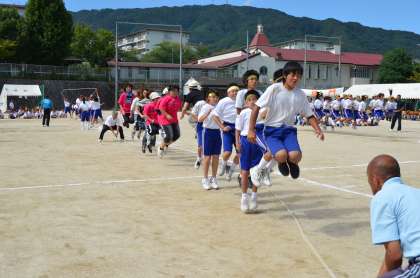 個人種目がすべて終わると、午前の部の最後を飾る“みんなでジャンプ(大縄跳び)”の開始です。T先生の指示で、いよいよ入場。