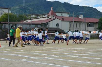 “位置について”、“ヨーイ”、“ドン”。この合図でみんなが棒に向かってかけ出します。棒に誰より先にたどり着き、一人で棒を持って帰る人もいれば、何人もの生徒が棒に群がり、なかなか勝負がつかないところもありました。