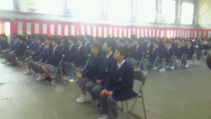 以下の写真は、入学式での生徒のようすと、1年担当教職員の発表風景、そして式後、保護者に学年主任が挨拶をしているところを撮ったものです。(画像が悪くてすみません)