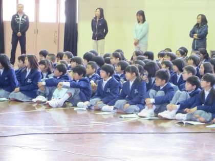 この写真は3年生からのプレゼントで、「地球星歌」という合唱曲です。