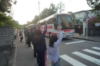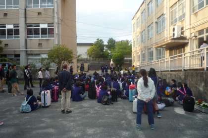 今日から3日間,3年生は沖縄への修学旅行です。朝6時,学校に集合。時間が早いので遅刻する生徒を心配していたのですが,大幅に遅れる生徒はなく,参加予定生徒が全員そろいました。ロータリー前で結団式を行いました。校長先生・実行委員生徒の挨拶,3日間お世話になる添乗員・カメラマンの方の紹介,諸注意の後,予定通り6時30分バスで出発しました。関西空港から,沖縄をめざします。また,朝早くから見送りに来ていただいた保護者のみなさま,ありがとうございました。ホームページは,適時更新しますので,お時間のある時にチェックしてください。よろしくお願いします。