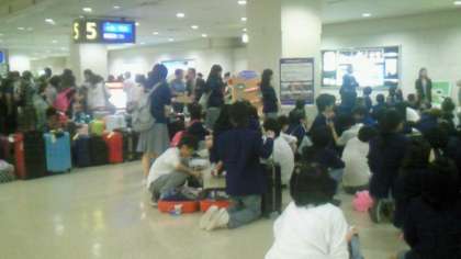 11時20分,定刻より少し遅れて那覇空港に到着しました。昼食は,すでに機内でとっているので,この後バスで,沖縄本島中部にある海洋博公園・美ら海水族館へと向かいます。雲の多い空模様ですが,雨はまだ降っていないようです。みんな元気に,また順調に行程は進んでいます。