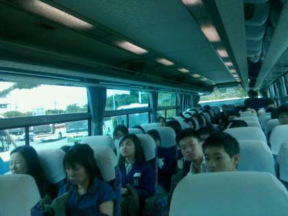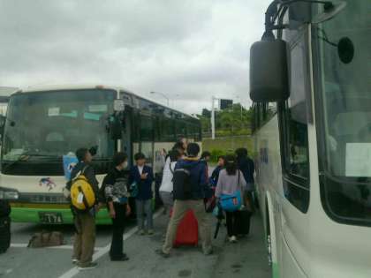 戦闘機は飛んでいませんでしたが,轟音を放つ哨戒機を1機見かけたとのこと。予定通り出発し、美ら海水族館に向かっていました。天気は,やはり曇り。気温は25度ですが,むし暑いそうです。学校から空港に向かうバスで気分が悪くなった生徒も,今は回復し,みんなと一緒に行動しています。