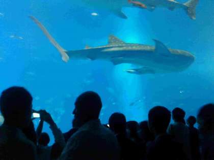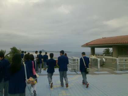 全員元気に美ら海水族館に入りました。ちょうどジンベイザメの餌付けの時間と重なったので,たくさんの観光客,他校の修学旅行生と一緒になったとのことです。左のの写真は遠くに伊江島が写っています。伊江島周辺の海の色がエメラルド色で,とてもきれいでした。
