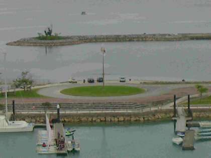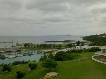 1枚目の写真は今日宿泊するホテルで、そのホテルから望む沖縄の海と遠くに伊江島が、また、手前には午後から活動する「もとぶ元気村」の体験場所が見えています。3枚目は、元気村のシンボルとなる旗とその周辺のようすです。天気は曇りなので、何とかこのままもってほしいと思います。