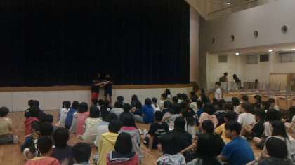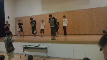 レクリェーションはクラス対抗形式で行われ,司会の二人がレクを大変盛り上げてくれました。内容は,前半に被害者は誰だ,○×クイズ,勝つのはどちらだ(番外編:この写真はどの先生?)といったクラス対抗のクイズ合戦が行われました。後半は,笑いに渦巻いた二人漫才(よくあれだけの台詞を覚えたものだと関心しました),サッカー部と男子テニス部による可愛らしいダンスが行われました。クラス対抗で優勝したのは4・5組で,2位には1組が入りました。準備にあたってくれた実行委員の皆さん,ご苦労様でした。また,名司会の進行のもと,協力してクイズに参加したり,拍手や笑いをくれた皆さん,ありがとう。とてもいい雰囲気でのレクリェーションでした。