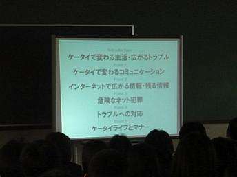 今年1月26日に2年生で「ケータイ教室」(1年生は昨年11月27日)を実施しました。今回は,保護者の方も一緒に学ぶ機会ということで親子道徳としてご参観いただきました。講師はKDDIよりお招きし,「便利なケータイ」は「危険なケータイ」でもあることを,パソコンによるスライド(パワーポイント)を使ってわかりやすく教えていただきました。その内容は・・・,
