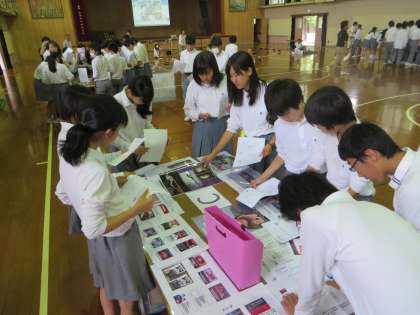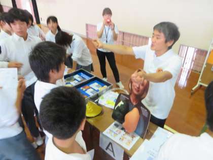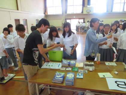 手にとって資料を見たり、用具を使って体験したり、解説してもらったりで、どれも生徒のとっても興味が持てる内容でした。