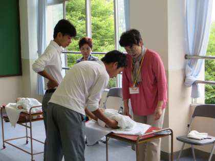 こちらは新生児人形を抱く体験の写真です。人形とはいえ、抱いてみるとみんな優しい穏やかな目になっていました。
