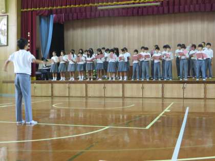 1年生は初めての合唱タイムの取組です。先輩たちの学年のフロアから聞こえてくる歌声を耳にして、わからないなりにも一生懸命練習に励んでいます。