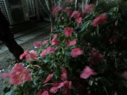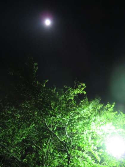 写真は、風の吹かれ激しく揺れる木々の葉や花々です。空には月が出ていたので、嵐のような状況の中、きっと天気は晴れなのでしょうね。