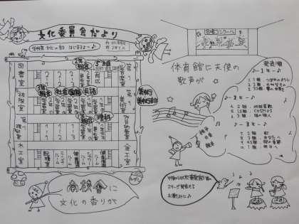 今日の展示鑑賞、合唱コンの曲目等が書かれたすてきな案内(イラストマップ)を、2年生女子の文化委員生徒がつくってくれました。(2枚目の写真)