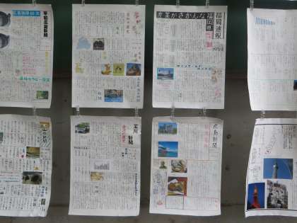 社会は、2年生が夏休みの宿題でつくった「都道府県PR新聞」の展示でした。