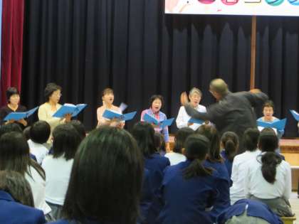 曲目はコブクロの“今咲き誇る花たちよ”、ジブリ映画「天空の城ラピュタ」の主題歌“君をのせて”、そして、ビギンの“島人ぬ宝”の3曲で、比較的みんながよく知っている曲での合唱でした。