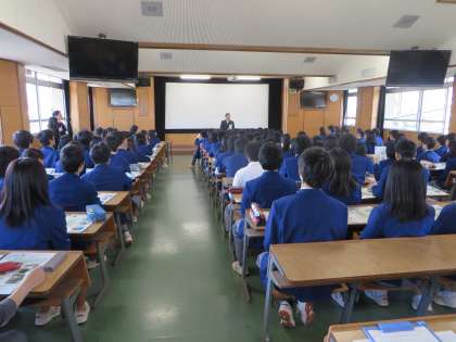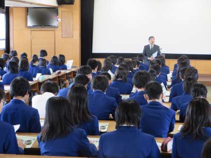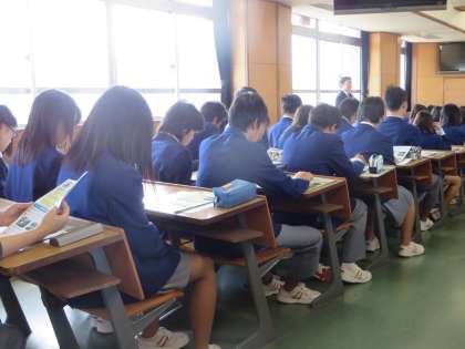 この写真は、学校説明会のようすです。資料を見ながら、高校の教育方針や高校生の進路、一週間の授業、学校のきまり、わが校の特色などを、時折笑いを交えながら説明していただきました。