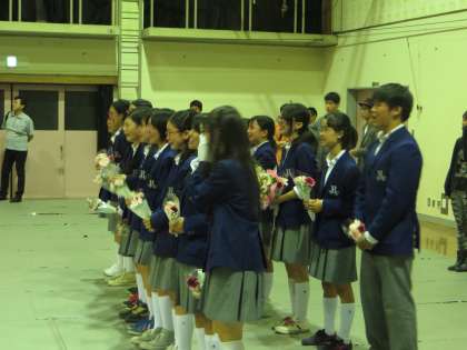 花道を退場し終わり、体育館の後方に整列した3年生は、顧問の先生や1・2年生に向かって、大きな声で「ありがとうございました」とお礼を述べ、約1時間の“音楽の夕べ”のプログラムはすべて終了しました。