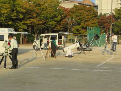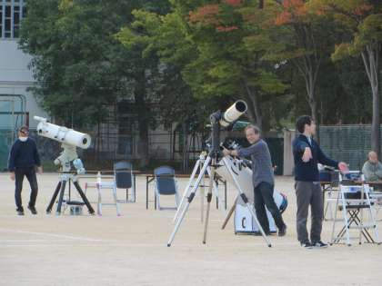 この取組は確か7年前から始まっており、“星クラブ57”のボランティアの皆さんに天体望遠鏡を持ち込んでいただき、本校のグランドで、毎年この時期に見える月や星座(星々)のガイドをしていただきながら、生徒・保護者や地域の方々に“月や星の観望”を楽しんでいただければと、おやじの会との共催で企画したものです。