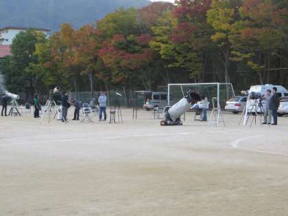 この写真は、夕方、天体望遠鏡を組み立て、“天体観測の夕べ”に備え準備をしているところです。見ての通りほぼ完了です。