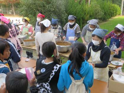 PTA・地域の皆さんも大変。一気に250食以上のご飯をよそって、カレーをたっぷりとかけるという作業。次から次に…。