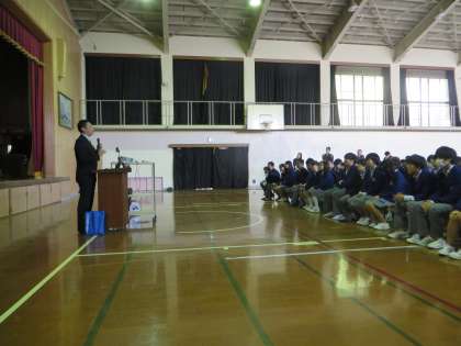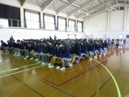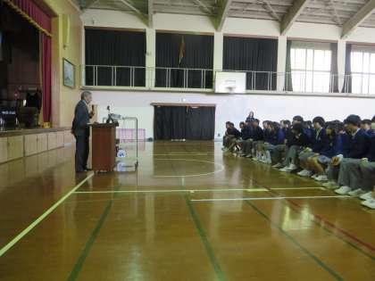 この写真は、前半の生徒・保護者が一緒に、高校の校長先生からのご説明をお聞きしている場面です。