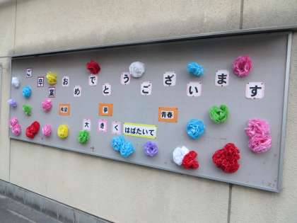 南校舎西壁面の掲示板に、3年生の卒業を祝うメッセージが貼られました。