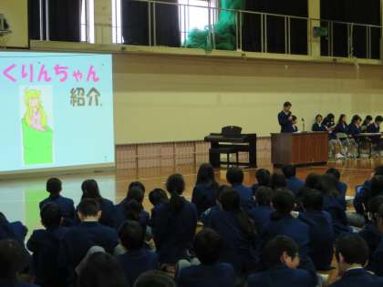 生徒会の各委員会の活動内容が説明され、最後に生徒会のマスコット“くりんちゃん”の説明がありました。