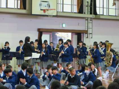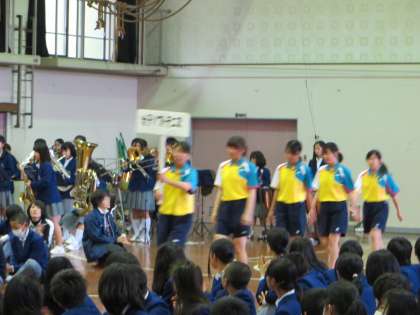 まずは、吹奏楽部の演奏でスタートです。吹奏楽部も“春体開会式”当日には西京極陸上競技場で、入場行進のための演奏をしてくれます。ありがとうございます。そして男女ソフトテニス部の登場です。