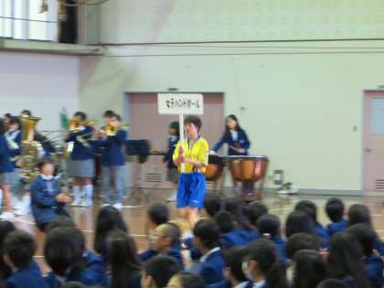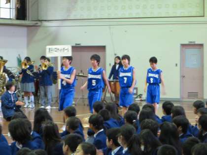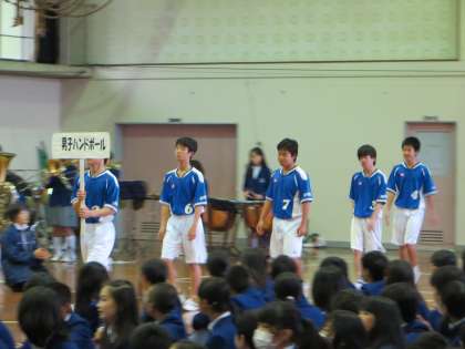 この写真は、男女ハンドボール部と男子バスケットボール部の入場のようすです。