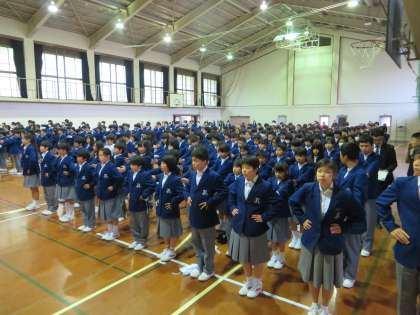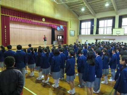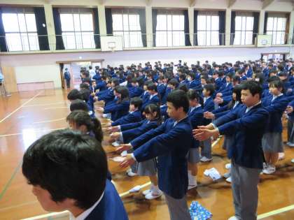 全校集会の体形で、3学年が揃うのは今日が初めてでしたが、先生の指示で、素早く、驚くほど静かにきちんと整列することができました。拍手喝采! 本当に素晴らしかったです。