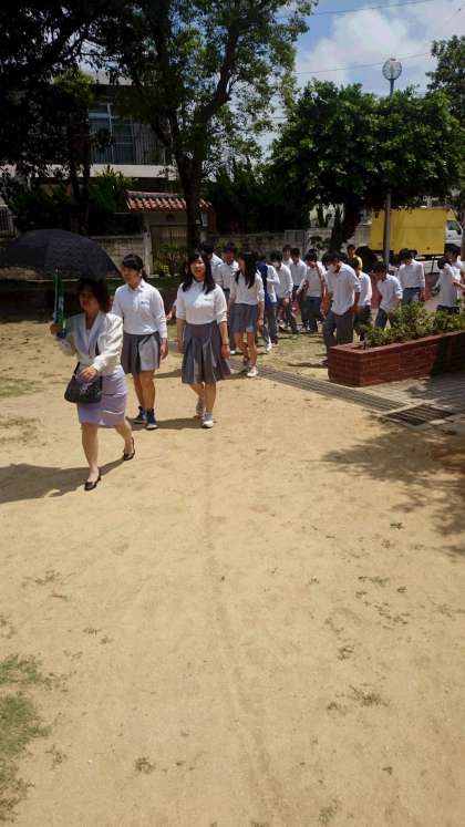 これからバスに乗り、宜野湾市の嘉数高台(かかずたかだい)へと向かいます。沖縄戦時の激戦地で、普天間基地も一望できます。日本軍が使用した「トーチカ」があり、戦争について学べる場です。沖縄の空は青く、天気はとてもいいです。そして、「さすが沖縄」と思うほど非常に暑いです。