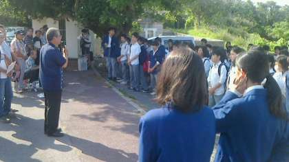 闘牛観戦・クラス写真撮影後,すぐ近くに移動し,いよいようるま市での民泊体験です。まずは入市式を行い,それぞれの民家の方に声をかけていただき,三々五々に各民泊場所へと移動しました。入市式では“生徒代表のあいさつ”の中で,JさんとNさんが沖縄の言葉を交え,楽しい雰囲気であいさつをしてくれました。暑かったので、多少しんどそうにしていた生徒も見受けられましたが,民泊先には笑顔で出発しました。
