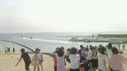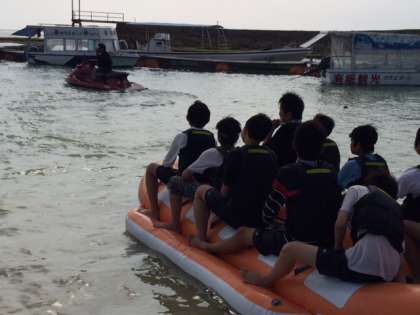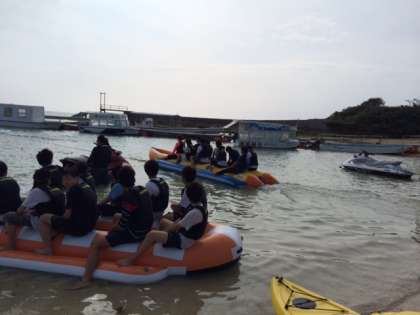 ドラゴンボートを楽しんでいます。沖縄の海遊びの定番です。先生も乗れたのでしょうか?