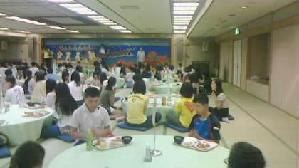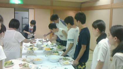 18時半より夕食となりました。Nくんの「いただきます」の合図で開始。やはり、砂浜での活動でお腹がすいていたのか、みんな食が進んでいました。楽しそうにおしゃべりをしながら食べていました。毎年2日目ともなると疲れから体調を崩し,夕食が食べられなかったり,保健用別室で安静にする生徒が出ることも多いのですが,今年の3年生はみんな元気です。夕食のあとは,館内でレクレーションです。