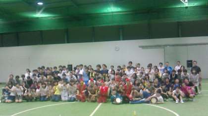 レクレーションでは,エイサーの歌・演奏と,生徒も太鼓を一緒にたたく体験コーナーもつくっていただき,楽しませていただきました。最後はエイサーの皆さんも交え,全員で記念写真を,「はい,チーズ!」