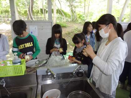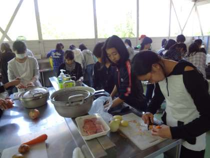 野菜の皮むきやそれを細かく切る人、お米をとぐ人、火をおこす人…。